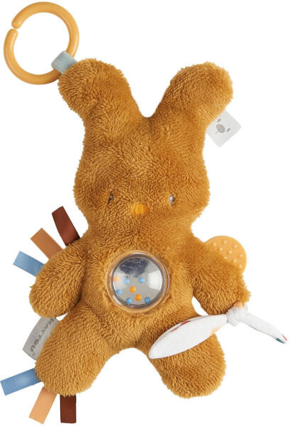 Babakocsira, kiságyra, hordozóra akasztható A Tipidou nyuszi foglalkoztató bújós játék egyszerre több szórakoztató tevékenységgel inspirál: csörgő, fogzási gyűrű az első fogzási fájdalmakra és különféle megfogási lehetőségek a felfedezéshez. A különlegesen puha anyagok és a különböző textúrák a tapintóérzék fejlesztését is ösztönzik, és felfedezésre