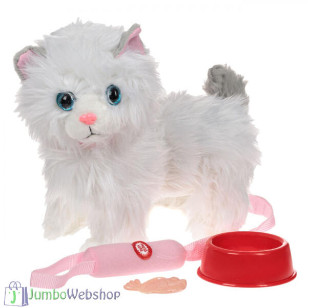Interaktív fehér plüss cica, távírányítóval sétál, nyávog. Tartozékok: etetőtál és halacska Csomag mérete: 26x16x26 cm * 3db AA elemmel működik melyek tartozékai a csomagnak ** Nem alkalmas 3 év alatti gyermekek számára