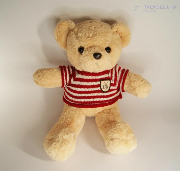 Plüss maci piros csíkos pólóban. 40 cm magas nagyon pihe-puha tapintású, álló plüss barna maci piros csíkos pólóban. A lábai nem merevek, így akár ültethető is, ha neki támasztja valaminek a hátát. Három éves kor alatt nem ajánlott! Szín: Barna, piros Származási hely: Kína Anyag: poliészter