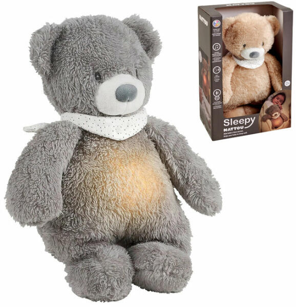 Puha plüss játék alváshoz Nattou medve formájában hímzett arcocskával és puha előkevel. A Nattou alvó medve gyönyörűen puha minőségű, kellemes töméssel. Az alvó medve hasában egy fény van, amely képes változtatni hét szín között és hangok között, fehér zajjal, tengerrel, szívveréssel és két nyugtató altatódallal, amelyek segítenek biztosítani a nyugodt alvá