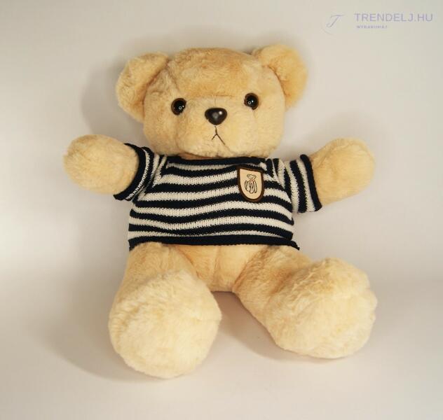 Plüss maci sötétkék csíkos pólóban. 40 cm magas nagyon pihe-puha tapintású, álló plüss barna maci sötétkék csíkos pólóban. A lábai nem merevek, így akár ültethető is, ha neki támasztja valaminek a hátát. Három éves kor alatt nem ajánlott! Szín: Barna, sötétkék Származási hely: Kína Anyag: poliészter