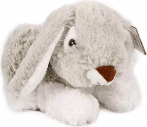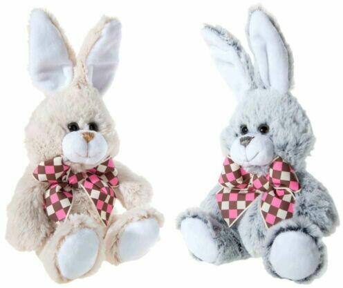 A puhán kitömött, ülő nyuszi pihe-puha szintetikus plüssből készült. A kockás masnival díszített nyuszi szürke színben kapható. Méret: 27 cm