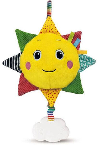 Egy pihe-puha plüss napocskával egészítheted ki gyermeked játékbirodalmát amelyet akár már újszülött kortól használatba vehet és a napocska feje tetején található akasztóval akár a kiságy oldalához, akár a babakocsihoz erősítheted. A sárga napocska felhúzható és zenélő funkcióval rendelkezik amely azonnal magára vonzza gyermeked figyelmét. Az alján található fe