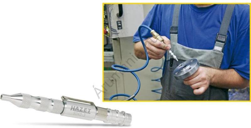 801528 Kifúvó pisztoly, Hazet 9040-3 Kifúvó stift Leírás Praktikus és tömör kivitel, felfüggesztõ klippel, pl. a mellsõ zsebre A légáram elforgatással beállítható Fúvóka: 3 mm átmérõjű Könnyen kezelhetõ, közvetlenül a 7,2 mm-es levegõ csatlakozóhoz csatlakoztatható Bemenõ nyomás: 12 bar Légáram: 360 l/perc 6 barnál Jó minõségű Perbunan tömítés (NBR) Dural
