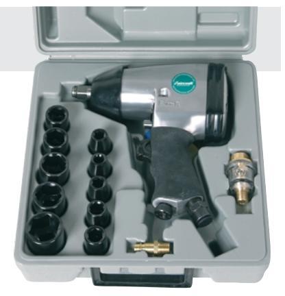 Műanyag kofferban Tartozékok: 10 db dugókulcs: 9/10/11/13/14/17/19/22/24/27 mm, hosszabbító, inline olajzó Műszaki adatok SET 1/2Cikkszám 2401100Levegő szükséglet 360 l / perc ( 6 bar )Nyomaték ca. 320 NmTömeg 2,2 kg