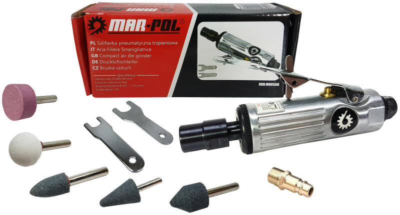 Pneumatikus egyenescsiszoló 9db Csendes és könnyen irányítható penumatikus csiszoló tartozékokkal és fokozatmnetes fordulatszám-szabályozással. A magas fordulatszámnak köszönhetően többféle területen is alkalmazható. Csomagolás tartalma:Egyenescsiszoló5 különböző csiszolótest Gyorscsatlakozó2 villáskulcsTechnikai paraméterek:Összekötő menet: 1/4Üzemi nyomás: 6.3