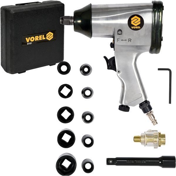 Pneumatikus ütvecsavarozó 312 Nm. Hajtásméret 1/2". 1/4" gyorscsatlakozóval rendelkezik. Levegőfogyasztás 622 l/min. Maximális fordulatszám 7000 rpm Pneumatikus kulcs Olajszűrő Tömlőcsatlakozó 1/4" Dugókulcs 9 mm, 10 mm, 11 mm, 13 mm, 14 mm, 17 mm, 19 mm, 22 mm, 24 mm, 27 mm Hosszabbító 1/2"; 125 mm 4 mm-es imbuszkulcs Mini olajozó Szerszámtartó mérete: 1/2" (12,7 mm) Szerszá