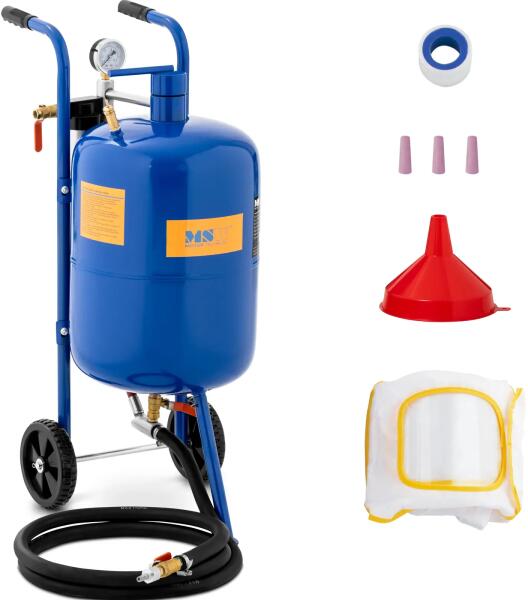 Az MSW szerszámok és készülékek közé tartozó MSW-MS40A homokfúvó gépe egy hatékony munkaeszköz felületek gyors kezeléséhez, mint a rozsda vagy öreg festék és makacs szennyeződések eltávolítása fémekről, üvegről, tégláról, műanyagról vagy fáról. A homokfúvó kényelmesen tartalmaz 40 l csiszolóanyagot és biztosítja a folyamatos munkavégzést gyakori utántöl