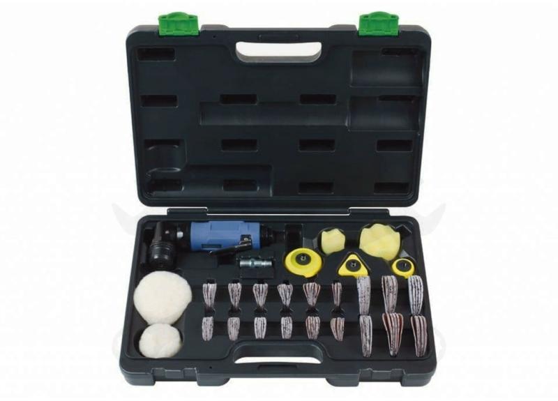 Laser Tools - UK Praktikus MINI levegős csiszoló és polírozó gép készlet. Ideális: Fényszóró polírozására, felületek tisztítására, felületek véglegesítésére. Tulajdonságok: - Csatlakozás: 1/4" bemenet - 3/8" - 10 mm mini tömlő - Fordulatszám: 13.000 Rpm -90°-ban hajlított fej - Hosszúság: 155 mm - Mélysége: 75 mm - Precíziós dupla pneumatikus csiszoló ötvözet