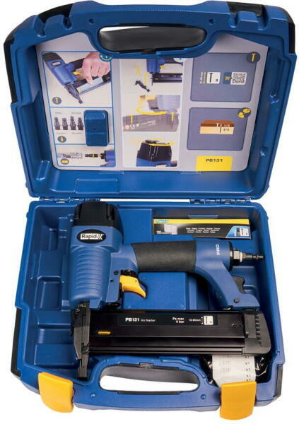 Airtac PB131 pneumatikus szögbelövő a Rapid márkától. Biztonsági kapcsoló. 360 °-ban állítható levegő kifújás. Könnyű magnéziumötvözet test. Állítható szögbelövési mélység. 8 sz. , 15–50 mm kapcsokkal és szögekkel történő munkavégzéshez. 300 db 30 mm-es szögből álló kezdőkészlet.