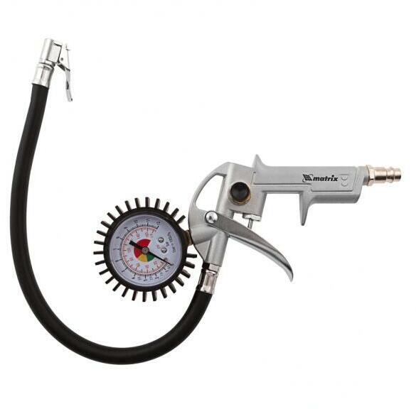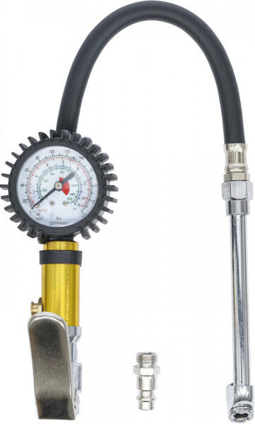 Gumiabroncs levegős nyomásmérő műszer, gyorscsatlakozó fejjel kiegészítve. Minőségi anyagokból összerakva, mely megkönnyíti a mindennapos használatot. Előszeretettel használják, gumi iparban, karosszéria iparban, és számos olyan helyen ahol pneumatikus, levegős gépek abroncs nyomása mérhető. Tulajdonságok: Szögletes töltőcsatlakozó Rugalmas csatlakozás a töltőcsat