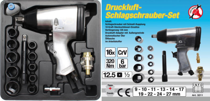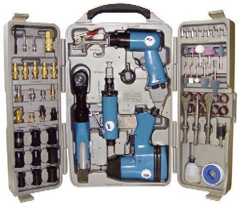 Műanyag kofferban, falra szerelhető. Hordozófogantyúval. Tartalom: 1 klt 1/2"-os ütvecsavarozó készlet 1 db 3/8"-os racsnics savarozó 8 db menetes dió az ütvecsavarozó és racsnis csavarozóhoz 1 db véső kalapács 4 adapter 1 egyenescsiszoló 3 db véső hatszögletű nyéllel 10 tekercs csiszoló 5 db csiszolóstift 1 db mini pneumatikus pisztoly 1 db kifúvó szelep 2 tűadapter Pne