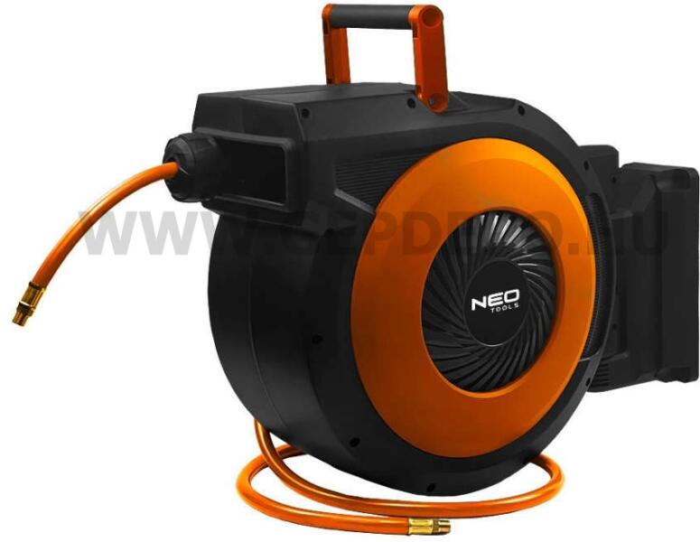 A NEO pneumatikus tömlődob, kompozit, 95 mm x 15 m (cikkszáma: 10-700) egy olyan eszköz, amely egyaránt alkalmas a barkácsolók és a professzionális felhasználók számára. A pneumatikus tömlődob PP anyagból készült házzal és 15 + 1 m-es pneumatikus tömlővel rendelkezik, amely PVC anyagból és gumiból készült. A tömlő méretei 9,5 x 15, 8 mm. A be- és kimenet 1/4" csatlak