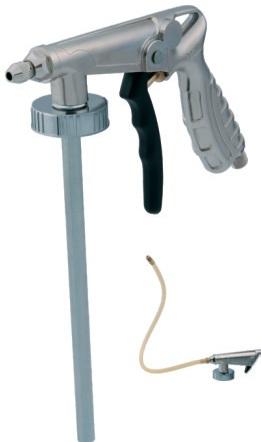 Jellemzők: Pneumatikus kenőanyagozó patronokból (400 g-os patronok) és nagy térfogatú tartályokból származó kenőanyagok felhordására. 275 mm-es hajlékony tömlő/170 mm-es ferde fúvóka kenőanyagok nehezen hozzáférhető helyekre történő felviteléhez Kivitel: patronos pisztoly (anyagtovábbítás a vezérlőkar megnyomásával), robusztus tár légtelenítő szeleppel/nyomód