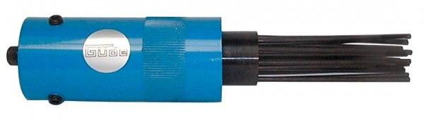 A 40066 Güde levegős tűleverő jellemzői A 40065 cikkszámú levegős vésőgép opcionális tartozéka különösen alkalmas rozsdamentesítésre hegesztési varratok méregtelenítése régi festék eltávolítása a habarcsról és egyéb maradványokról sima és egyenetlen területeken különösen a sarkokban és szegletekben A tűszőnyeg egyedi tűkből áll, amelyek egyenként is cser