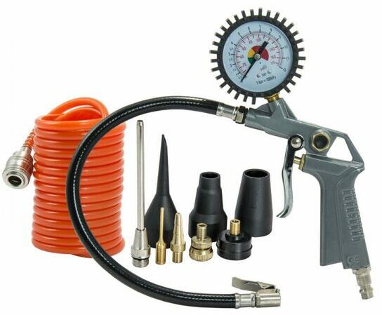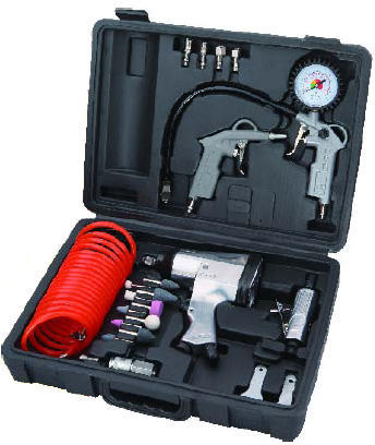 Tartalma: 1 db 1/4" furatköszörű, 1 db 1/2" légkulcs, 1 db lefúvató pisztoly, 1 db tömlőfúvató manométerrel, 1 db spiráltömlő, 3 db dugókulcs (14, 17, 19 mm), 2 db szerelő kulcs, 1 db csatlakozó, 1 db befogó tokmány, 2 db 1/4" belső menetes dugó, 2 db 1/4" külső menetes dugó, 10 db csiszoló kő, 1 db műanyag koffer A furatköszörű műszaki adatai: Fordulatszám: 25000 R