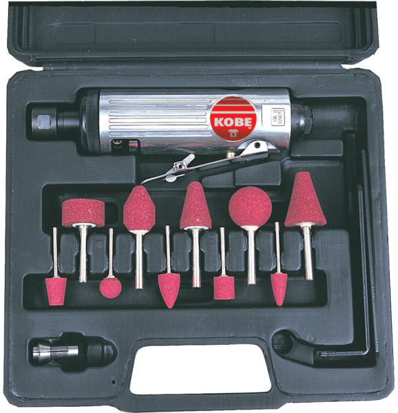 GD22LK A készlet tartalma: GD2206L egyenes csiszoló biztonsági kapcsolóval működtetett fojtószeleppel, 3 és 6 mm-es szorítópatronok, 10 db-os csapos csiszolókő szortiment, robusztus fröccsöntött műanyag dobozban.