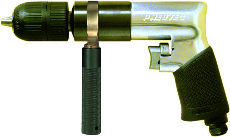 Robosztus 13 mm-es fúrógép irányváltóval. Sűrített levegő elvezetés és hangtompítás a fogantyún keresztül. Szigetelt markolat és kiegészítő fogantyú. Gyorsszorító tokmány 13 mm-ig. Max. fordulatszám: 450 ford. /perc Tokmány: 1 - 13 mm Súly: 1,4 kg Levegő igény: 7 l/s Sűrített levegő csatlakozás: R 1/4" Zaj: 84 dB(A)