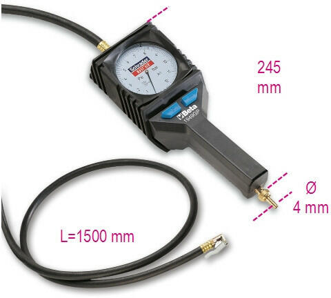 A KÉP CSAK ILLUSZTRÁCIÓ! JELLEMZŐK: Lefúvó és felfújó pisztolyok EWG-Manométer skálával 0,7÷12 bar (1/10 bar felosztásban) Mindkét szervós nyomógomb lehetővé teszi a gumiabroncs pontos és gyors felpumpálását (+) és gyors leeresztését (-) Kalibrálási bizonyítvánnyal együtt szállítva Ütésálló burkolattal és akasztó füllel szállítva Menetcsatlakozás: 1/4" GA
