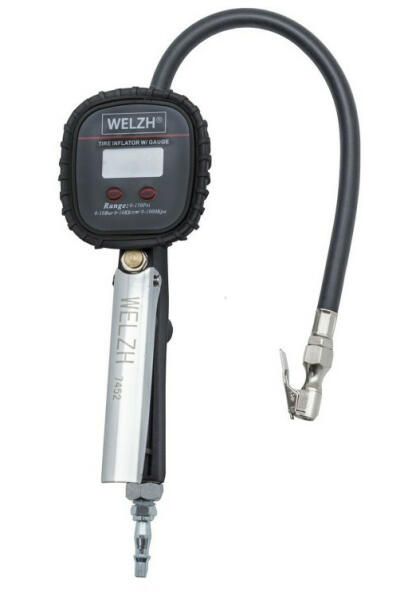 Welzh-Werkzeuge Digitális nyomásmérő óra hosszú 400 mm-es kerékfúvató tömlővel Tulajdonságok: - Anyaga: Acél - Gumi óraburkolat - Könnyen működtethető ravasz - Jól látható monochrome- digitális kijelzővel szerelt - A kijelző órát gumiburkolat védi az esetleges ütödésektől - Hosszú 400 mm-es kerékfúvató tömlővel - 2 darab mechanikus gombbal szerelve Gombok: HÁT