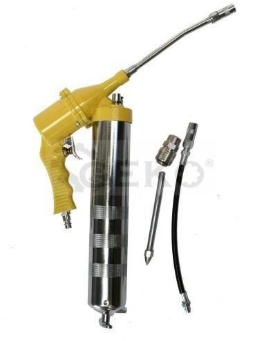 Geko pneumatikus vagy kézi karos zsírzópisztolyként is használható zsírzóprés. Pneumatikus / kézi zsírzópisztoly olyan műhelymunkákhoz, ahol precizitás és pontosság szükséges. A zsírzópisztoly hegyei illeszkednek a szabványos zsírzógombokhoz. 400 ml-es tartállyal, légtelenítő és nyomáscsökkentő szeleppel felszerelve. – cserélhető fejek - kézi karos vagy pneumat