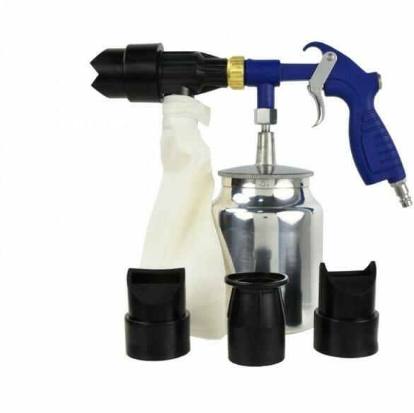 Geko homokfúvó pisztoly homok visszanyeréssel. Ideális rozsda, szennyeződés eltávolításhoz mindenféle acélfelületről, felnikről, karosszériaelemekről, mezőgazdasági gépekről, építőipari gépekről stb. A pisztoly lehetővé teszi a csiszolóanyag visszanyerését az anyagzsákba úgy, hogy a pisztolyfejet a homokfúvott elemhez nyomja. A készülék homokkal, üveggel és ko