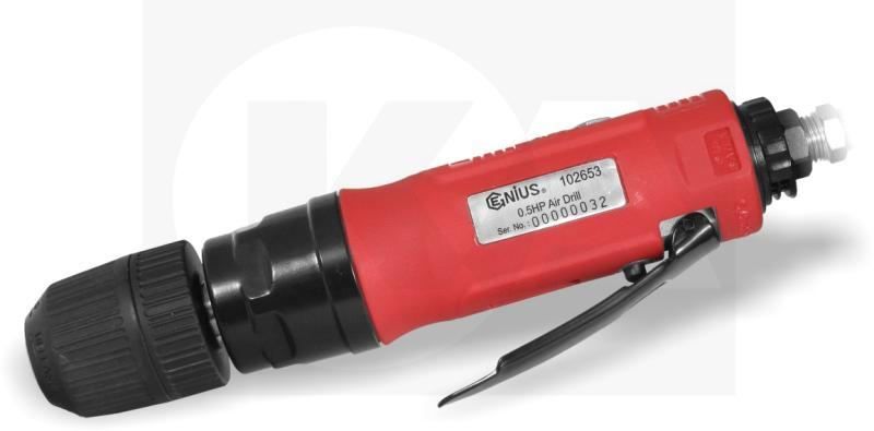 Pneumatikus fúró, gyors kioldó (quick release) tokmánnyal. Tokmány méret: 1 - 10mm; 3/8" - 24 UNF motor teljesítmény: 0.5 lóerő terhelés nélküli fordulat: 2.600 fordulat/perc 2 fokozatban állítható sebesség. Hossz: 225 mmKiszerelés: 1 db-os