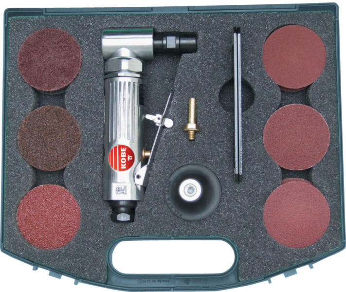 A többcélú készlet a következőket tartalmazza: felületkezelő korongok, midegyikből 1 db: finom, közepes, durva Csiszolókorongok, szemcseméretenként 2-2 db: P36, P60, P80 és P120 1 db 6 mm-es szár az alaptárcsához Kobe derékszögű csiszoló 1/4" NPT levegő-bemeneti csatlakozóval 10 mm-es levegőtömlőhöz, 90 PSI / 6.2 bar légnyomás, 4 CFM / 144 liter/perc* levegőfogyasztá