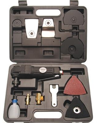 Angol nyelvű leírás (a magyar fordítást lásd lejjebb):versatile 3-in-1 air tool: Delta Sander - Saw - Scraperpowerful operation due to the high vibrationperfect for working in hard to reach areas and close to cornerstriangular sanding pad: 76 mm (3"), 45°diamond cutting discWorking pressure 6.2 barair inlet: 1/4 "-18 NPTmax. oscillations: 18,000 bpmair consumption 170 l/minnoise LpA = 86 dB