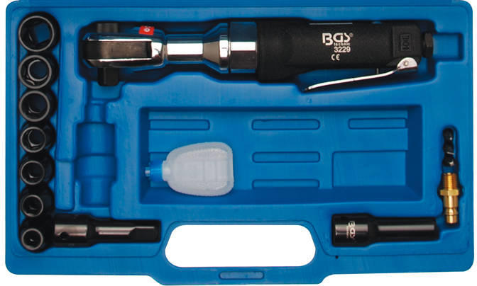 Angol nyelvű leírás (a magyar fordítást lásd lejjebb):air consumption 113 l/minincludes the following tools:Ratchet wrench 12.5 mm (1/2") with switch on the right/leftspring-loaded ball bearing (operating with 90 PSI), length 250 mm7 impact sockets 9 - 10 - 11 - 13 - 14 - 17 - 19 mm75 mm extension bar1 bit holder 75 mm3 bitsMagyar fordítás (fordító automata segítségével):levegőfogyas