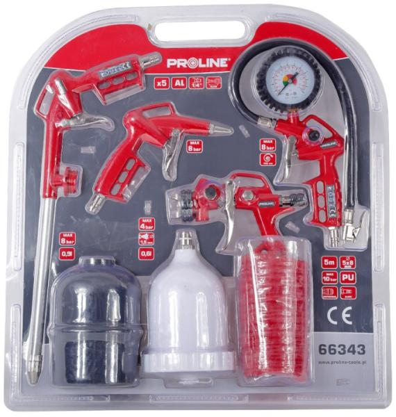 Készlet tartalma: - Festékszóró pisztoly felsõ tartályal (66345) - Manométeres felfújó pisztoly (66346) - Lemosó pisztoly (olajszóró pistoly) alsó tartályal (66347) - Légfúvó pisztoly (66348) - Pneumatikus PU spirál légtömlõ (66350)