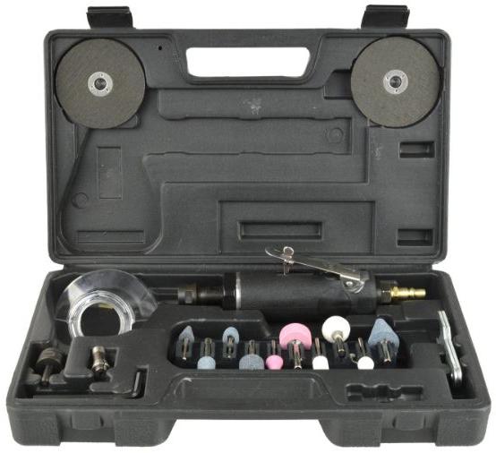 Pneumatikus csiszoló készlet műanyag kofferben. Műszaki adatok: maximális fordulatszám: 18.000 fordulat / perc üzemi nyomás: 6,3 bar levegőfogyasztás üzemi nyomáson: 158 liter / perc levegőcsatlakozás: 1/4″ A készlet tartalma: 1 db pneumatikus csiszoló 2 db vágótárcsa ∅ 75 mm 10 db csiszolókő 1 db szikravető védőburkolat 2 db villáskulcs: 14, 17 mm 1 db imbuszkulcs 1 d
