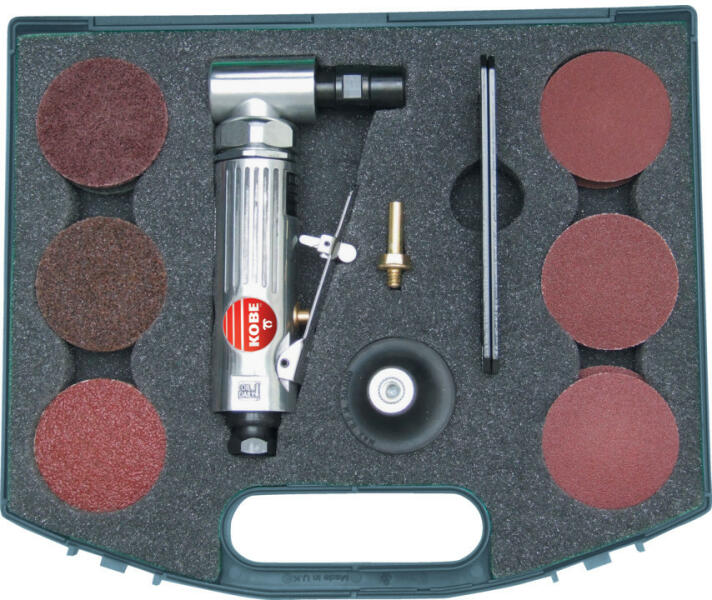 A többcélú készlet a következőket tartalmazza: felületkezelő korongok, midegyikből 1 db: finom, közepes, durva. Csiszolókorongok, szemcseméretenként 2-2 db: P36, P60, P80 és P120. 1 db 6 mm-es szár az alaptárcsához. Kobe derékszögű csiszoló 1/4 NPT levegő-bemeneti csatlakozóval 10 mm-es levegőtömlőhöz, 90 PSI / 6. 2 bar légnyomás, 4 CFM / 144 liter/perc* levegőfogyasz
