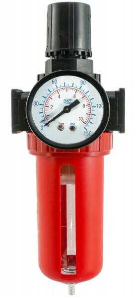 Légszűrő manométerrel és szabályozóval 1/4" Légszűrő kompresszorhoz víz és szennyeződések szétválasztásához. A manométernek és a szabályozónak köszönhetően beállítható a szükséges kimeneti nyomás. A manométer mérési tartománya 0 – 10 bar. Technikai paraméterek:Menet: 1/4"Üzemi nyomás: 0 – 10 barÜzemi hőmérséklet: +60°C