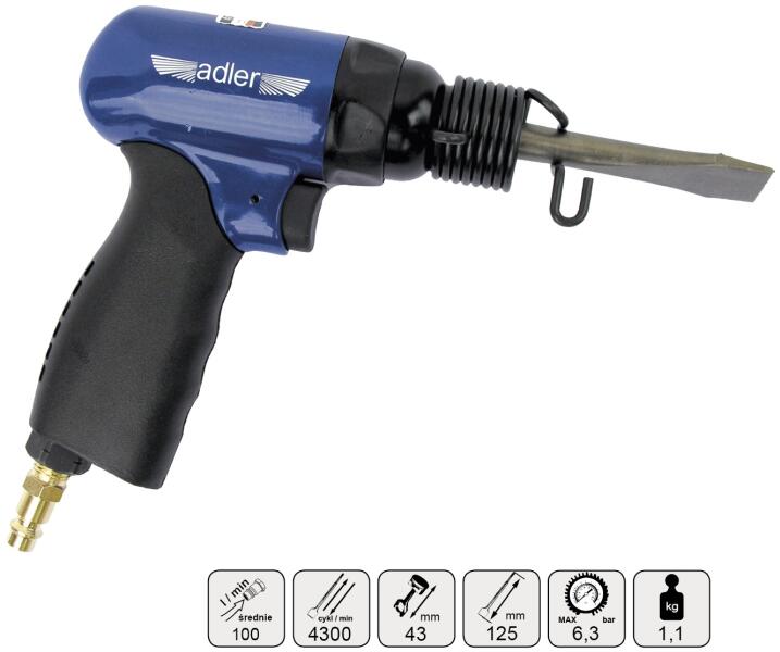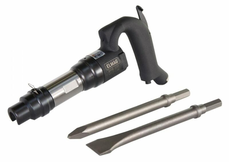 Kiváló minőségű, erős igénybevételre tervezett pneumatikus vésőgép. Cserélhető hatszögű vésőtartó. A hattyúnyak kialakítású test stabilabb fogást eredményez. Finoman szabályozható kapcsoló, 10,5 mm-es hatszögű vésőtartó. Percenkénti löketszám: 4.400/perc. A szerszám hosszúsága 200 mm, súlya 1,3 kg, zajszintje 103,6 dB. Műszaki adatok:Percenkénti löketszám