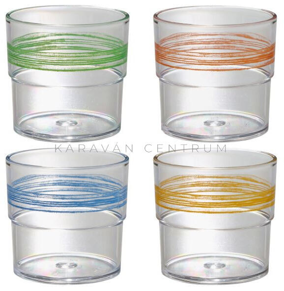 Mosogatógépben mosható, élelmiszerbiztos anyagból készült színes vizespohár szett. Kristálytiszta megjelenés, törésálló és kemény felület. Anyag: SAN (Styrol-Acrylnitril-Copolymer) Űrtartalom: 23 cl Méret: 80 x ø 75 mm 4 darabos készlet - 1-1 db zöld, narancs, kék és sárga