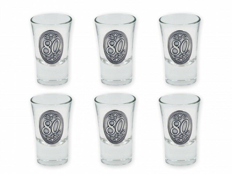 Pálinkás pohár 80. születésnapra fémcimkés 6db 3,4cl - Óncímkés Pálinkás készlet Befoglaló méretek 39x5x7.5 cmAnyaga üveg, fém