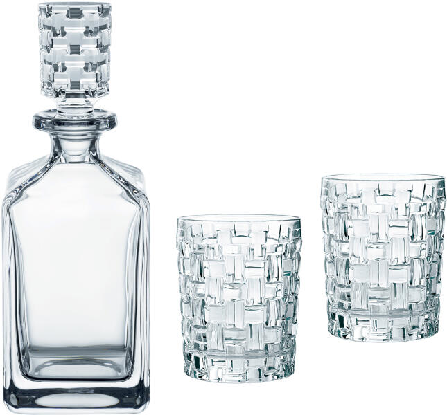 A Bossa Nova whiskys készlet a következőket tartalmazza: 2 db whiskys pohár 1 db palack / dekantáló dugóval