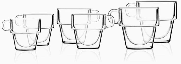 - Egyszerű és elegáns dizájn. - A dupla falak tovább melegen tartják az italt. - Az üveg ellenáll a homályosodásnak és a hősokknak. - Kényelmes fogantyúja van. - Az egymásra rakás lehetősége segít helyet takarítani a konyhában. - A termék érintkezhet élelmiszerrel. - Nem mosható mosogatógépben. - Kapacitás: 150 / 280 / 350 ml. - Méretek: 8 x 7,5 x 4,5 / 9 x 9 x 5,8 / 1