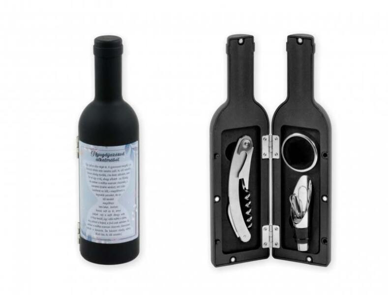 Boros szett Nyugdíjazásod alkalmából 3db-os A szett tartalma: üvegnyitó/dugóhúzó, cseppfogó karika és borkiöntő dugóval. Befoglaló méretek: 6.5x6.5x24 cm Termékjellemzők: Anyaga: fém; műanyag Alkalom: Nyugdíjazás Kinek ajánlott: Felnőtteknek