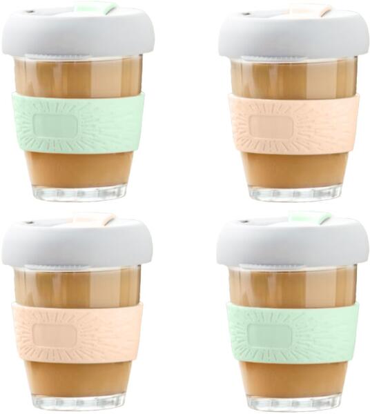 Négy Quasar &Co. szemüvegből álló készlet, To Go fedéllel és szilikon védőhüvellyel. A csésze szilikon To Go fedelét nem csavarják fel, hanem tömörítéssel rögzítik. Modern design. A szilikon hőszigetelő hüvely kényelmet és védelmet nyújt a forró italok számára. Akár munkába tart, akár csak egy éjszakára, a szilikon hővédelemmel ellátott üveg kávéscsész
