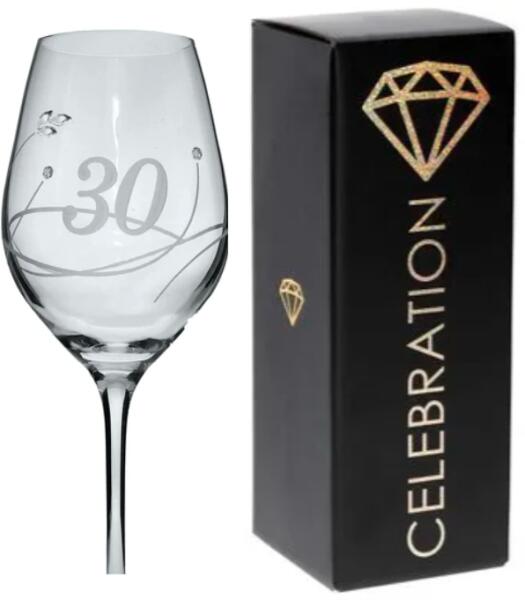 Évfordulós pohár elegáns díszítéssel, amely a kehely körül húzódik, elöl számmal, kristályokkal díszítve.