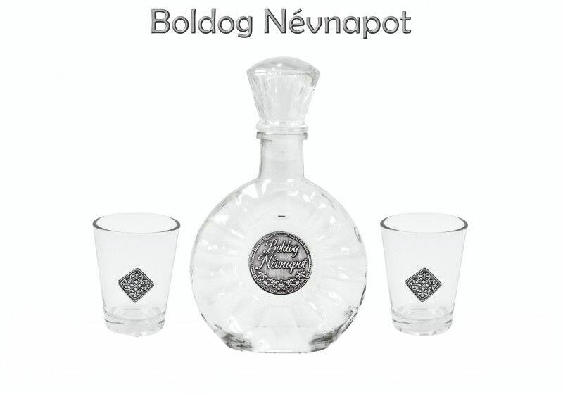 Óncímkés Pálinkás készlet 0,2l palack 2 pohár Boldog Névnapot - Óncímkés Pálinkás készlet Óncímkés pálinkás készlet 0,2l palack 2db pohárBefoglaló méretek 12x4.5x21 cmAnyaga üveg, fém