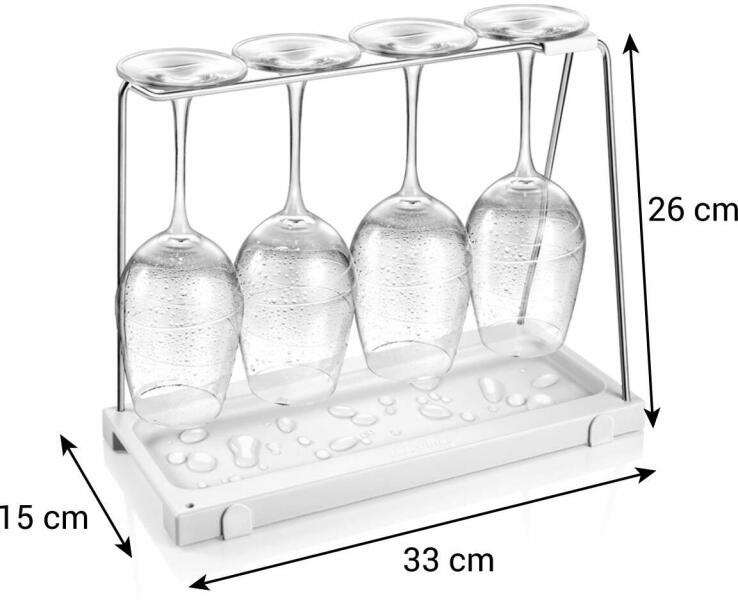 FlexiSPACE Borospohár tartó csepegtetővel 330 x 148 mmKiválóan alkalmas elmosott borospoharak szárítására, és azok biztonságos tárolására a konyhapulton vagy a konyhaszekrényben. Minden szokványos típusú szárral ellátott borospohárhoz alkalmas. Két vagy több tartó könnyen összekapcsolható. Ellenálló műanyagból és első osztályú rozsdamentes acélból készült, cs