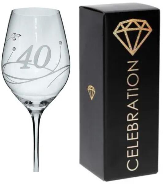 Évfordulós pohár elegáns díszítéssel, amely a kehely körül húzódik, elöl számmal, kristályokkal díszítve.