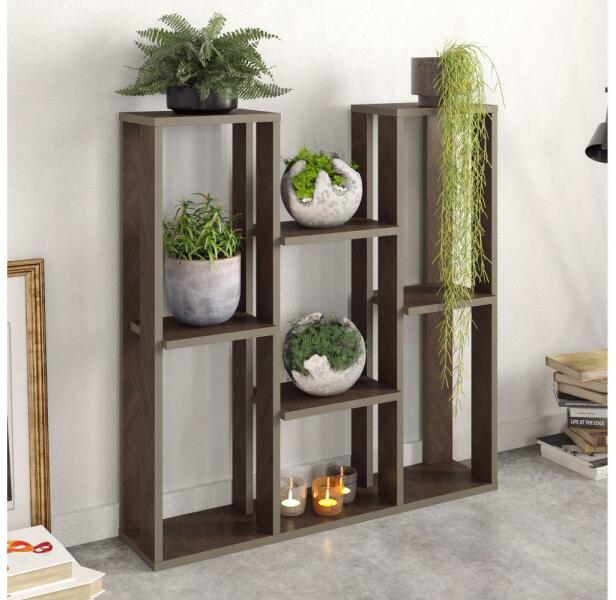 Barnaszínű növényállvány. Egyszerű, modern stílusának köszönhetően bármilyen otthonba illik. Megfelelő virágok, dekorációk és még sok minden más bemutatására. Laminált forgácslapból készült. Az anyagvastagság: 1,8 cm. Az állvány méretei a legmagasabb ponton: 93,2 x 89,6 x 21,9 cm. Fa mintázata: diófa.