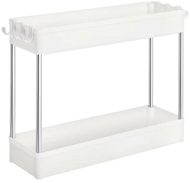 2 szintes kiegészítő konyhai tároló kispolc. A peremmel ellátott polcok 4 függőleges acél rúddal kapcsolódnak, a 40 x 13 cm-es polcfelület rendkívül helytakarkos, ennek ellenére rengeteg kisebb használati tárgynak tud helyet biztosítani. A megmelt polcperemek megakadályozzák a tárgyak leesését. A konyhai felhasználás mellett praktikus megoldás iróasztalokhoz, fürdőszob