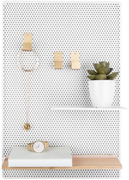 - Egyszerű és elegáns dizájn. - Három kampót és két különböző méretű polcot tartalmaz, melyek szabadon elhelyezhetők a rendszerező felületén. - Maximális terhelés: 5 kg. - Méretek: 52 x 34,5 x 10,5 cm.