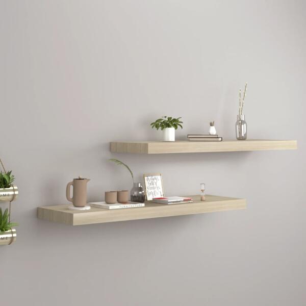 vidaXL 2 db tölgyszínű MDF lebegő fali polc 80 x 23,5 x 3,8 cm Ez a 2 stílusos fali polcból álló szett az otthona fókuszpontja lesz. A láthatatlan rögzítőrendszernek köszönhetően ez a fali polc könnyen felszerelhető, és tökéletes hely különböző tárgyak, például díjak, könyvek, gyűjtemények, dísztárgyak stb. elhelyezésére. Ez az állvány minőségi méhsejt szer