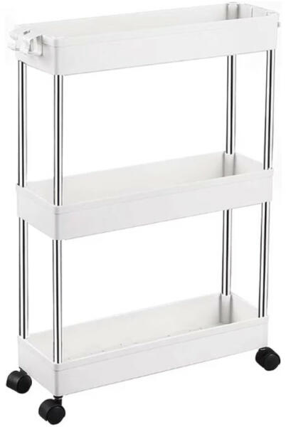 3 szintes kerekes tároló polc. A peremmel ellátott polcok 4 függőleges acél rúddal kapcsolódnak, a 40 x 13 cm-es polcfelület rendkívül helytakarkos, ennek ellenére rengeteg kisebb használati tárgynak tud helyet biztosítani. A megmelt polcperemek megakadályozzák a tárgyak leesését. A konyhai felhasználás mellett praktikus megoldás iróasztalok mellé vagy fürdőszobában. F